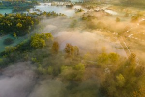De Avelgemse Scheldemeersen op een mistige voorjaarsochtend gezien vanuit de lucht.