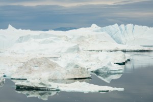 Zicht van bovenaf op de diverse vormen en maten van ijsbergen in de fjord.